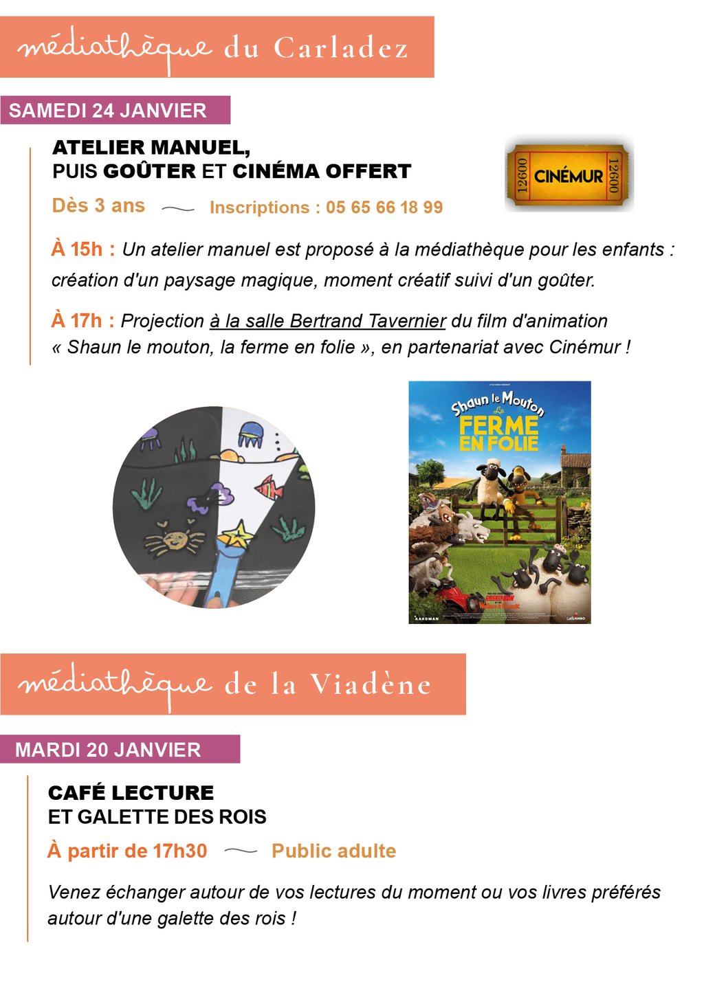 - Samedi 24 janvier à 17h : à la salle Bertrand Tavernier, projection du film d'animation Shaun le mouton, la ferme en folie, en partenariat avec Cinémur. Entrée libre.