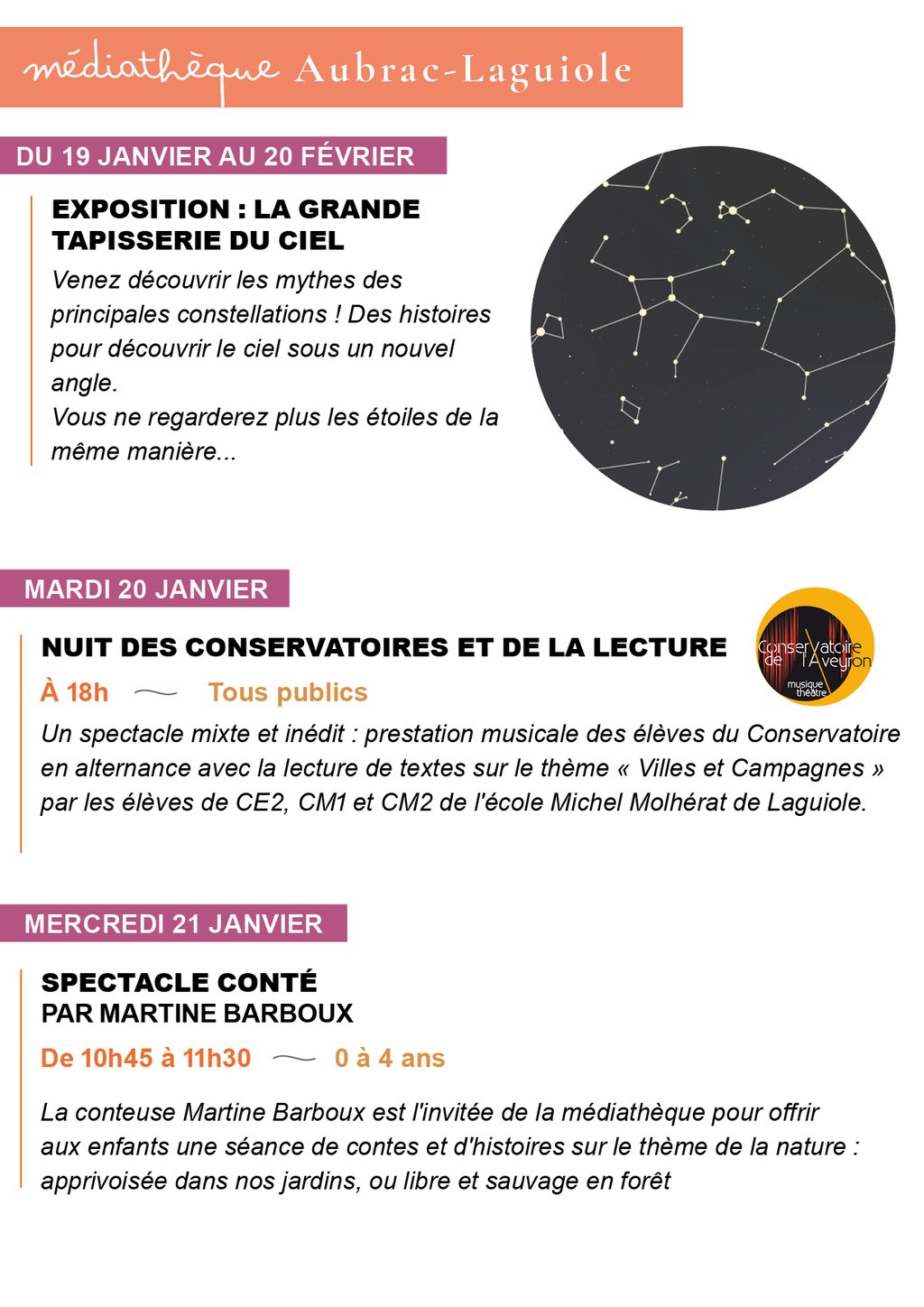 - Mardi 20 janvier à 18h : Nuit des conservatoires et de la lecture – un spectacle entre prestation musicale des élèves du Conservatoire et lecture de textes des élèves de l’école Michel Molhérat de Laguiole. Tous publics.