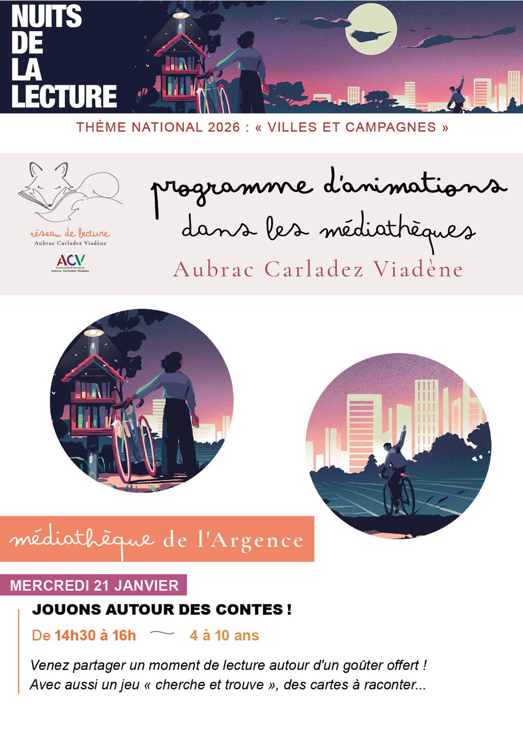 Le réseau de lecture Aubrac Carladez Viadène propose, à l’occasion des Nuits de la Lecture dont le thème 2026 est « Villes et Campagnes », un programme varié au sein de ses médiathèques.