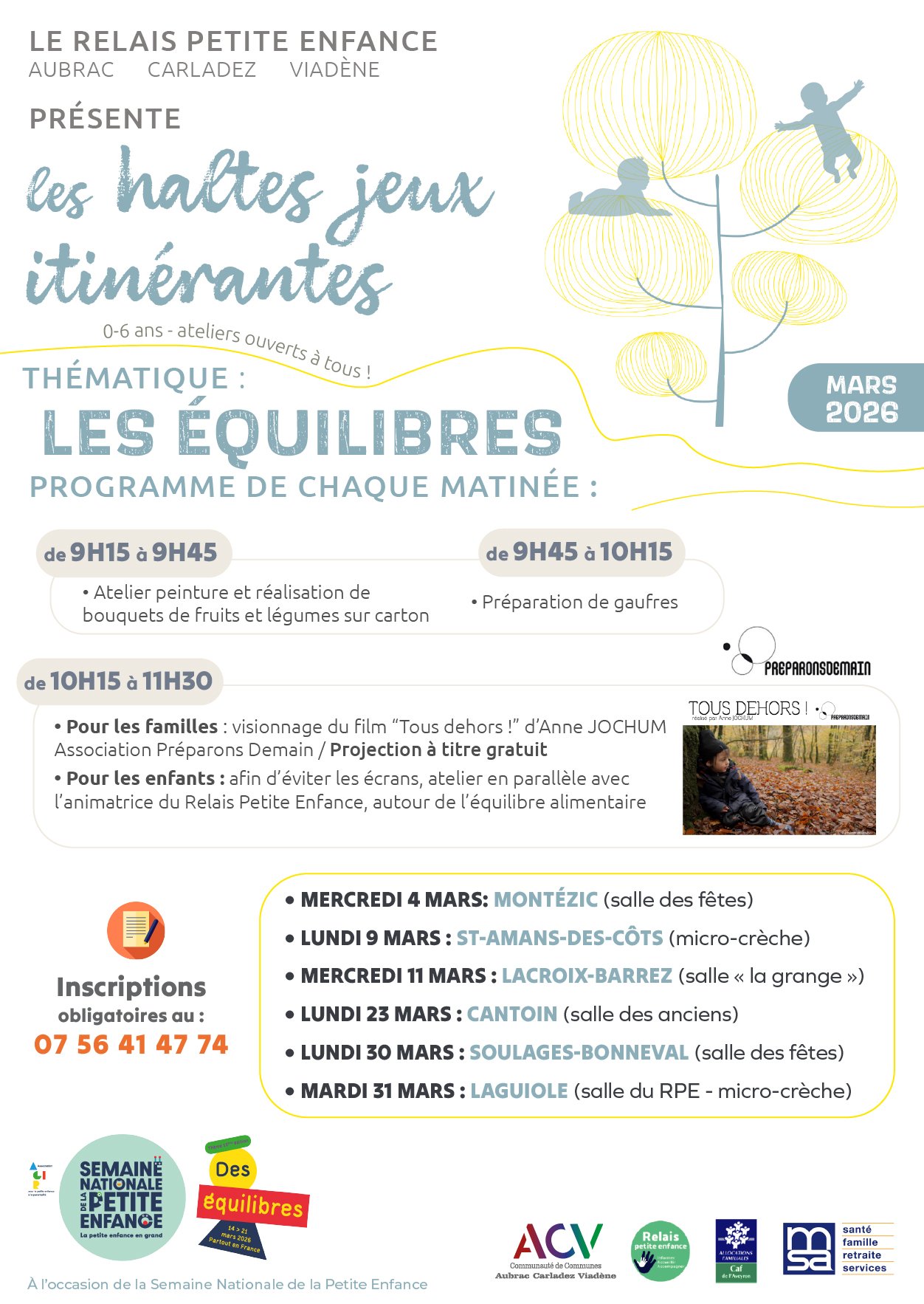 En mars, le Relais Petite Enfance propose un programme varié, avec des ateliers de médiation culturelle et des haltes jeux - matinées thématiques autour des équilibres. Voici une première partie du programme... Restez à l'affût pour la suite !