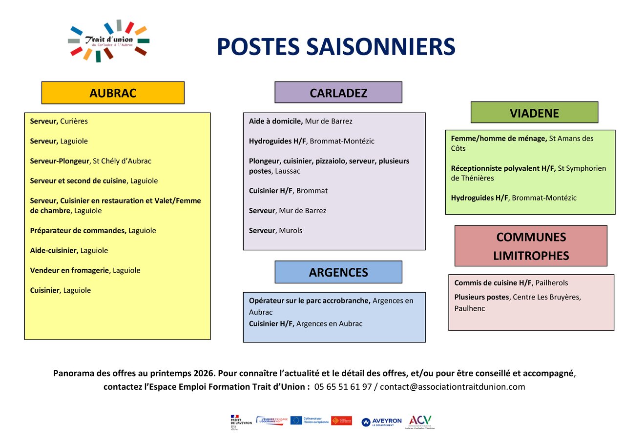 Découvrez les opportunités d'emploi sur le territoire : l’association Trait d'Union répertorie régulièrement les offres par bassin de vie. Retrouvez également les offres saisonnières pour les mois à venir.