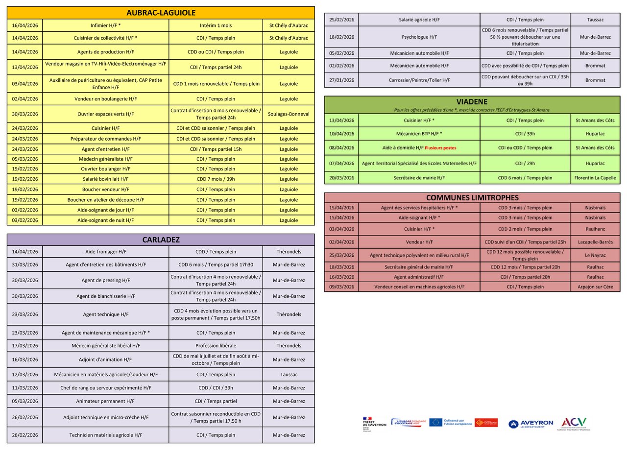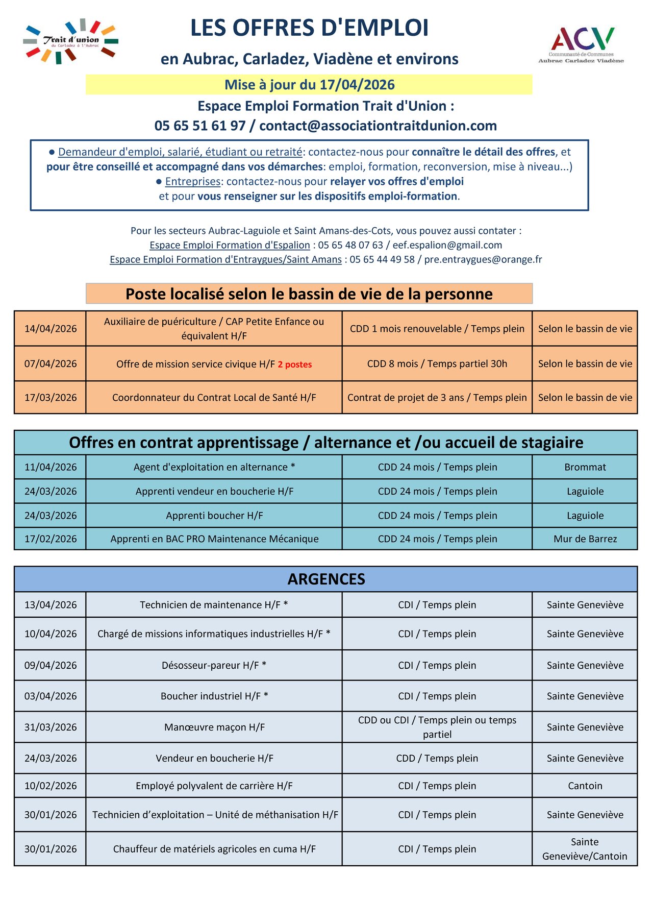 - 2 CAP Petite Enfance / Auxiliaires de Puériculture - 1 contrat de remplacement à Laguiole, et 1 poste itinérant