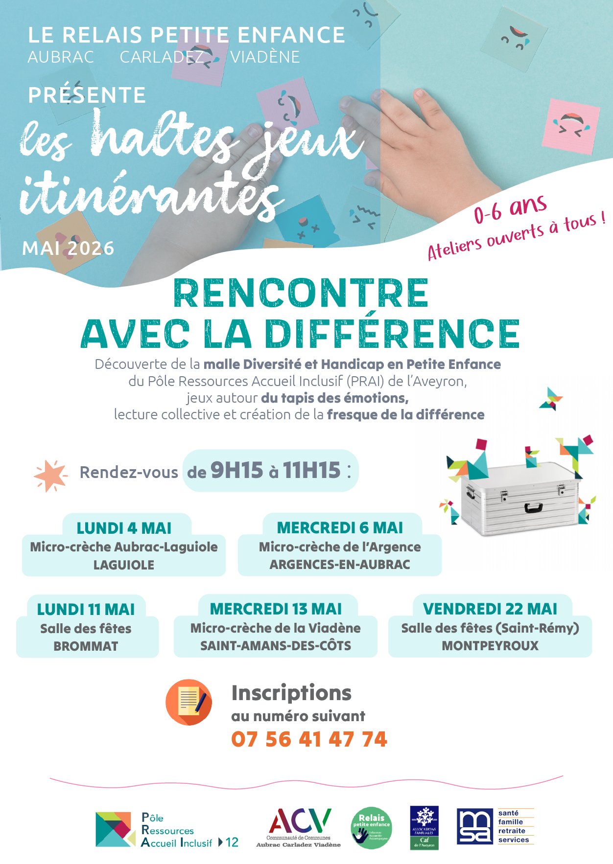 En lien avec le Pôle Ressources Accueil Inclusif (PRAI) de l’Aveyron, le RPE propose des haltes jeux autour de la différence. Au programme, découverte de la malle "Diversité et Handicap en Petite Enfance", jeux autour du tapis des émotions, lecture collective et création de la fresque de la différence...